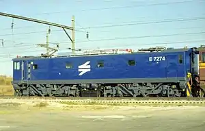 Beginning in 2000, seventeen Class 7E3 locomotives, sixteen Series 1, numbered in the range from E7260 to E7275, and one Series 2, no. E7276, underwent significant modifications. This included the installation of Hitachi micro-processor controls with improved rheostatic brakes, auxiliary inverters designed and built by Fuji Electric, Thelma and Cutler-Hammer rheostat grids, fans by Donkin Fans in Port Elizabeth, and conversion from double-cab to single-cab since the no. 2 end cab space was required for some of the new equipment which was installed. These single-cab locomotives were reclassified to Class 7E4 and the first of them entered service early in 2001.[1][4]