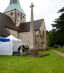 In the churchyard is the tall South Harting War Memorial Cross, (1920),[4] a World War I memorial by Eric Gill with the bas relief of St Patrick attributed to Gill being by Hilary Stratton.[5]