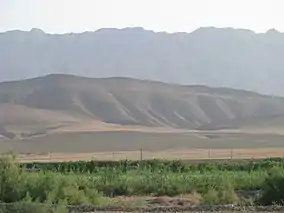 Kuftin was invited to Central Asia to carry out explorations in 1949. He first reconnoitered Turkmenistan and selected a very large tepe (hill), the Altyndepe (in Turkmen language meaning: the "Golden Hill" ). This tepe overlooks the Tedzen delta at the foot of Kopetdag. He found a Neolithic settlement extending into Bronze Age in southern Turkmenistan near the village of Miana, a settlement of 25 ha area with a total stratification thickness of 30 metres (98 ft) with an 8 metres (26 ft) strip of human habitation. This excavated tepe turned out to be a large settlement, 2.5 kilometres (1.6 mi) in length and 0.5 kilometres (0.31 mi) in width, and was identified as a major Bronze Age town. From the highest point of this tepe, a trench was dug to a depth of 30 metres (98 ft) and the section was logged, which revealed layers of the Bronze Age, of neolithic and Eneolithic periods. Ceramics collected from the different layers of the trench enabled Kuftin to establish the sequence and chronology of the findings. One year after he started sequencing the site, he died suddenly and was replaced by Vadim Mikhailovich Masson who published a book on the Bronze Age sequence of this site. The settlement of Ilgynly had also shifted to Altyndepe. Early Bronze period fort walls with decorated towers and a huge entrance had encircled this settlement, though when found, they were in ruins.[6][9] Discoveries by Soviet archeologists dated the finds at this place, in a chronological order, to the later half of the third millennium BC.[10] Altyn-Depe also provided a link to the several Bronze Age cultures of Eurasia.[11]