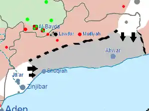The AQAP was beginning to take parts of other remaining areas of southern Abyan from the beginning of February, when they entered Ahwar and other towns. During the fight for Awhar, 3 AQAP fighters were killed by Southern Movement fighters in a fight in a checkpoint.[5][6] The major offensive began in the dawn of 20 February, with the AQAP first taking Ahwar, then Shuqrah, in one day fighting, that resulted to the death of 3 Hadi government loyalists. Also on the same day, AQAP attacked the new base of the Hadi government in the port city of Aden, killing one tribal leader and one of his bodyguards. After the tribal fighters abandoned the southern Abyan, and headed for the north, AQAP set up their flags in the government building, establishing a sharia court, and an Emirate, that is led by Tawfiq Belaidi, the brother of Abu Hamza al-Zinjibari, who was killed in a U.S. drone strike on 3 February.[7][8]