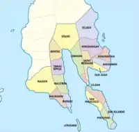 The province originally comprised 16 municipalities and 349 barangays, with four islands: Panaon Island, Limasawa Island, San Pedro Island and San Pablo Island.[9] After the inauguration of the province, three more municipalities were subsequently created: San Ricardo from Pintuyan, Tomas Oppus from Malitbog and Limasawa from Padre Burgos.