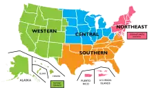 Until 2021, the Boy Scouts of America was divided into four regions for administrative purposes — Central, Southern, Western, and Northeast.[1] Each region was then subdivided into areas. Each region had a volunteer president, assisted by volunteer officers and board members, and the day-to-day work of Scouting was managed by the regional director, assistant and associate regional directors, and area directors. Regions and areas were subdivisions of the National Council and did not have a corporate status separate from the BSA.[2]