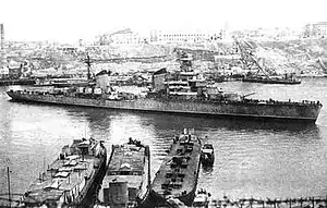 Voroshilov was withdrawn from active operations, however, after the loss of three destroyers that were attempting to interdict the German evacuation of the Taman Bridgehead to air attack on 6 October 1943. This loss caused Stalin to forbid the deployment of large naval units without his express permission which was not granted during the rest of the war.[12] The ship was transferred to Novorossiysk on 18 August 1944 and to Sevastopol on 5 November.[7] She was awarded the Order of the Red Banner on 8 July 1945.[13]