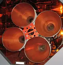In 1931 Glushko was redirected to work on liquid propellant rocket engines.[15] This resulted in the creation of ORM (from "Experimental Rocket Motor" in Russian) engines ORM-1 to ORM-52.[6] To increase the resource, various technical solutions were used: the jet nozzle had a spirally finned wall and was cooled by fuel components, curtain cooling was used for the combustion chamber[13] and ceramic thermal insulation of the combustion chamber using zirconium dioxide.[11] Nitric acid, solutions of nitric acid with nitrogen tetroxide, tetranitromethane, hypochloric acid and hydrogen peroxide were first proposed as an oxidizing agent.[11] As a result of experiments, by the end of 1933, a high-boiling fuel from kerosene and nitric acid was selected as the most convenient in operation and industrial production.[13] In 1931 self-igniting combustible and chemical ignition of fuel with gimbal engine suspension were proposed.[11] For fuel supply in 1931–1932 fuel pumps operating from combustion chamber gases were developed. In 1933 a centrifugal turbopump unit for a rocket engine with a thrust of 3000 N was developed.[11] A total of 100 bench tests of liquid-propellant rockets were conducted using various types of fuel, both low and high-boiling and thrust up to 300 kg was achieved.[4][6]