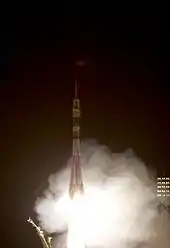 The Soyuz spacecraft launched from the Baikonur Cosmodrome in Kazakhstan on Tuesday, 7 June 2011 at 20:12 UTC (8 June 2011, 02:12 local time).[4] Originally expected to dock with the International Space Station around 05:22 pm EDT on Thursday, 9 June 2011,[5][6] the Soyuz docked with the ISS at 5:18 pm EDT, four minutes ahead of schedule.[2] The spacecraft carried to the ISS a three-person crew (Sergey Volkov, Russia; Michael E. Fossum, U.S.; Satoshi Furukawa, Japan).[7] The crew landed in Kazakhstan at 02:26 UTC on 22 November 2011.[3]