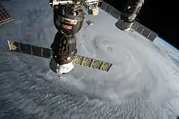 ![]() Soyuz TMA-17M flying above Typhoon Soudelor while docked to the ISS | |