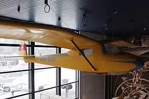 Following the prototype there were three variants of the S.21, differing chiefly in their fuselage structures, but most S.21s were S-21Hs, otherwise known as S.21-Is.[3][4] These had wood-framed fuselages, oval in section and plywood-skinned. The forward seat was ahead of the wing leading edge, under a transparent, multipart canopy. The wing was raised above the main fuselage on a streamlined pedestal which also enclosed the rear seat, with rectangular windows on each side. Access was via a port-side door. The fuselage tapered rearwards to a small fin that carried a large, curved balanced rudder with a rather pointed tip. Its nearly triangular tailplane was largely forward of the rudder hinge. The elevators were rounded in plan.[2]