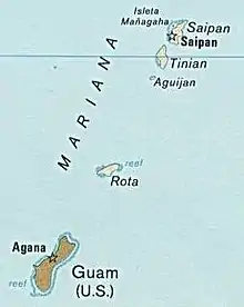 The southern islands of the Mariana Islands archipelago. The distance between Guam and Saipan is about 135 miles (218 km)