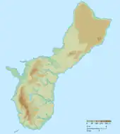 Topographical map of Guam, which is characterized by volcanic hills in the south and a limestone plateau in the north