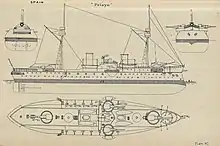 Pelayo was a battleship of the Spanish Navy which served in the Spanish fleet from 1888 to 1925. She was the first battleship and the most powerful unit of the Spanish Navy at the time. Despite its modern design for the time, Pelayo and the rest of the Spanish Asia-Pacific Rescue Squadron never engaged in combat during the Spanish–American War. Some historians have argued that had the battleship, along with the modern armored cruiser Carlos V, participated directly in the conflict the course of the war would have been altered dramatically and possibly lead to a Spanish victory, thus retaining Spain's status as a colonial power.[1]