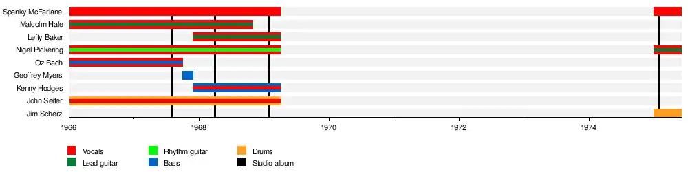 | Lefty Baker (real name Eustace Britchforth Baker) | January 7, 1939 | Roanoke, Virginia | August 11, 1971 | California | lead guitar, banjo, vocals (1967–69) |