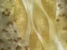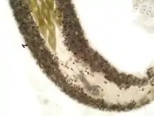 An infection by S. chrysophrii causes lethargy due to the hypoxia and severe anaemia.[9] Sitjà-Bobadilla et al.[10] evidenced the following histopatological effects: lamellar shortening, clubbing and synechiae, proliferation of the epithelial tissue with resulting fusion of the secondary lamellae, and marked presence of chloride cells. S. chrysophrii causes severe pathogenicity (gill lesions, systemic anemia, lamellae fusion, sloughing of epithel cells) even at the low infection intensity (eight parasites per gill arch).[12] De Vico et al.[13] observed that in infected seabreams' spleen there was a dramatic increase in size and number of splenic melanomacrophage centres, suggesting increased levels of the hemosiderin (resulting from the erythrocyte's destruction) and lipofuscin, common in tissue catabolism and degenerative chronic disorders.[14][15] Secondary infections with other parasites and bacteria are common for the S. chrysophrii-infected seabream.[16]
