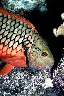 Sparisoma is a genus of parrotfishes native to warmer parts of the Atlantic. FishBase recognizes 15 species in this genus,[4] including S. rocha described from Trindade Island in 2010[5] and S. choati described from the East Atlantic in 2012.[6] They are the most important grazers of algae in the Caribbean Sea, especially since sea urchins, especially Diadema, the other prominent consumers of algae, have been reduced in many places by a recent epidemic.