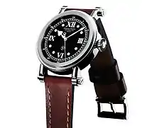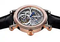 The first timepiece to bear the Speake-Marin name was a hand-made tourbillon pocket watch, called the Foundation Watch because it formed a template for future Speake-Marin watches[12] through the spade-shaped hands and pleated crown, watchmaker’s topping-tool motif, (here in the shape of the tourbillon cage) and hand-engraving.[13]
