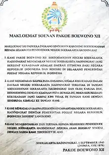 - ↑ Mahany, Andry Trisandy (2022-09-17). "Amanat 5 September 1945". Special Province of Daerah Istimewa Yogyakarta Government. Retrieved 2023-06-22.