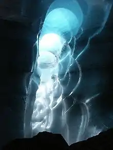 Under favourable conditions late summer, it was possible to walk the 200 to 300 metres (660 to 980 ft) from one end to the other underneath the glacier. It was never considered safe to walk under a glacier. Speilsalen collapsed in August 2007.[1]