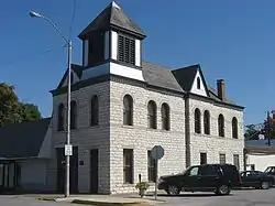 Spencer Town Hall and Fire Station is a historic town hall and fire station located at Spencer, Owen County, Indiana. It was built in 1897–1898, and is a two-story, rectangular, Romanesque Revival style limestone building with a corner bell tower. It measures 24 feet wide and 61 feet long and has a hipped roof. The building was used for municipal purposes until 1975.[2]: 2 In 2005, the building housed law offices.