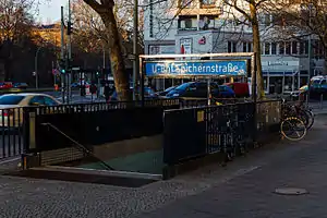 - ↑ At Berliner-Untergrundbahn.de, U3 Spichernstraße Archived 2010-04-13 at the Wayback Machine states "around 200 metres", while Die Wilmersdorf-Dahlemer Schnellbahn Teil 1: Die Wilmersdorfer U-Bahn Archived 2011-07-28 at the Wayback Machine states "100 metres away". (in German)