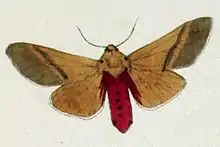 Antennae of male has short branches. Head and thorax ochreous, frons black, palpi crimson and black above. Paired black spots can be seen on shoulders and tegulae. Abdomen crimson in both sexes above and whitish below with a dorsal and two paired lateral series of black spots. Thorax ventrally and femur are crimson colored. Forewings are ochreous. A fuscous oblique band runs from costa to beyond the middle of the center of inner margin. Hindwing ochreous. The inner area suffused with crimson color. Cilia of both wings are whitish.[2]