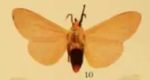 Head, thorax, and abdomen orange, antennae, palpi, and legs black, paired black spots on underside of the abdomen, the four middle segments on the upperside black in both sexes. Wings pale orange without marking.
