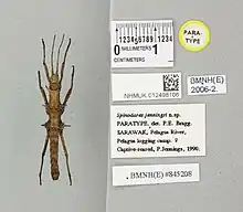 Philip Edward Bragg described the genus Spinodares together with its only species Spinodares jenningsi in 1998. The genus name is a combination of the name of the similar genus Dares and "Spino" cause of the large spines by which this genus differs from Dares. The holotype of Spinodares jenningsi is a female found in a logging camp on the River Pelagus and deposited at the Natural History Museum in London. It was collected on August 8, 1990 along with two other females and one female nymph. All specimens survived a few weeks in the UK. One female survived at Paul Jennings for about one year and laid eggs during this time, from which nymphs hatched, which were fed with bramble leaves. Some of them could be reared to the subadult instar. The originally collected specimens, as well as eight nymphs from Jennings offspring and some eggs laid by the holotype are deposited as paratypes in the Natural History Museum, the Oxford University Museum of Natural History, the Naturalis Biodiversity Center in Leiden and in Jennings' private collection. The species name was chosen in honor of Paul Jennings.[2][3] In 2004, Oliver Zompro described the previously unknown male based on a specimen from the Zoological Museum in Hamburg that had originally been stored in alcohol. It was collected by H. Winkler between July 18 and 23, 1924 on Bgatla Raja (today Bukit Raya), the highest mountain in the Schwaner mountain range.[5]