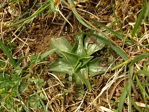 The plant needs many years to grow large enough (eight years) to produce above-ground parts, and to produce a flowering stalk (another three years). Even then, it mostly flowers once every few years, and will during hard times not surface at all. The stem is greyish green, usually 7–20 cm (2.8–7.9 in) (in Southern Europe exceptionally 40 cm) high, unbranched, erect, and terete. Especially further up, the stem is covered with short transparent glandular hairs. Below the flowers stand three to seven grayish green, acute leaves that envelop the stem, with membranous edges and three to five veins. Sometimes the withered leaf remains of the rosette of the previous year are still visible at the base of the stem.[2]