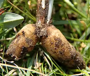 Underground there are two to four (or exceptionally six), egg-shaped or ovate-oblong, hard tubers which are usually 1–3 cm (0.39–1.18 in) long and ¾–1½ cm (0.3–0.59 in) in diameter, slightly tapering towards the tip. They are pale brown and smooth with short transparent hairs on the outside. These tubers, as in many orchids, have an earthy musty smell, originating from the mycorrhiza. There are no thick filamentous secondary roots as in many other orchids.[2]