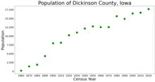Dickinson County is a county located in the U.S. state of Iowa. As of the 2020 census, the population was 17,703.[1] The county seat is Spirit Lake.[2] The county was organized in 1857 and is named in honor of Daniel S. Dickinson,[3] a U.S. Senator for New York.