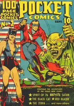 Patriotic superhero Gary Blakely, the Spirit of '76, was created by writer Joe Simon and artist Bob Powell.[1] The personification of American folklore's Spirit of '76, the character appeared in Harvey's Pocket Comics from #1 to 4 (August 1941 - January 1942).[2] In his first appearance, the character, a student at West Point, fought Nazi fifth columnists on the campus. Pocket Comics #1 also introduced fellow cadet Tubby Reynolds, who figures out Gary's secret and serves as his sidekick. Tubby's sister Susan, a WAC lieutenant serves as love interest.[3] By issue #2, the character was fighting Satan himself, along with a recurring foe, femme fatale Satana.