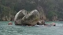 Tokangawhā / Split Apple Rock is a geological rock formation in Tasman Bay / Te Tai-o-Aorere off the northern coast of the South Island of New Zealand. Made of granite from the cretaceous,[1] it is in the shape of an apple which has been cut in half. The cleft to produce two sides of the 'apple' was a naturally occurring joint.[2] Joints occur commonly in granite and are planes of weakness that rain and waves exploit. The traditional Maori myth for the formation describes two gods breaking apart the rock.[3]