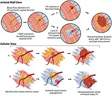 While the molecular mechanisms that underpin SCAD are still poorly understood, studies have implicated dysfunction of the vasa vasorum, the microvessels that perfuse the muscular layer of the coronary artery, lead to the bleed. There is an inverse correlation between the amount of vasa vasorum present in regions of the coronary artery and the likelihood of an area being affected by a SCAD.[1] It has been hypothesized that alterations in vessel wall strength, owing to dysfunction in the TGF-β pathway, the extracellular matrix, and vascular smooth muscle cell contractility alter the capacity of the vasa vasorum to perfuse the vessel wall, leading to either (1) a potential microthrombi and bleed, or (2) an area of hypoxia, which would likely induce new microvessel formation angiogenesis of new immature (and thus leaky) vessels.[1]