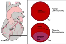 SCAD symptoms are the result of a restriction in the size of the lumen of the affected coronary artery. A bleed within the wall of the artery (tunica intima) originating from the microvessels that perfuse this muscular layer (vasa vasorum) leads to a collection of blood, or hematoma, between the layers of the artery wall.[1] The hematoma pushes close the lumen, preventing blood from flowing to the heart muscle (myocardium). In some cases (~30%) this hematoma (also referred to as an intramural hematoma) is also accompanied by a tear in the inner most layer of the artery - a monolayer of endothelial cells called the tunica intima. It is not clear if this precedes or follows a bleed within the wall of the artery.[9] The tracking of blood within the artery wall (both in the presence or absence of an intimal tear) is referred to as a "false lumen".[10][11][12] The restriction of blood flow in the 'true' lumen limits the availability of oxygen and nutrients to the heart muscle, or myocardium. As a result, the myocardium continues to demand oxygen but is not adequately supplied by the coronary artery. This imbalance leads to ischemia, damage, and in some cases can lead to death of the myocardium tissue, causing a heart attack (myocardial infarction).