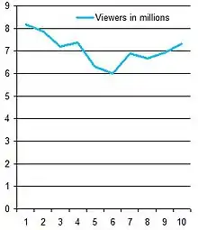 The second series began with overnight viewing figures of 7.8 million.[12] The second episode lowered slightly to 7.6 million viewers, which was about a third of the television audience,[13] while the third episode dropped to 6.9 million viewers,[14] and the fourth rose slightly to 7.2 million, often winning its timeslot against repeats of ITV1's The Darling Buds of May.[15] Following the week interruption from Wimbledon, the fifth episode slipped to 6.1 million,[6] and to six million for the sixth episode,[16] before the seventh episode rose to 6.6 million.[17] Overnight ratings rose to seven million for the second series finale.[18] With consolidated figures factored in, the second series was seen by a per-episode average of 7.19 million viewers.[n 4]