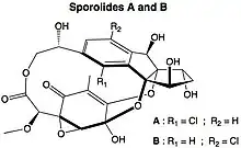 Sporolides A and B are polycyclic macrolides extracted from the obligate marine bacterium Salinispora tropica, which is found in ocean sediment. They are composed of a chlorinated cyclopenta[a]indene ring and a cyclohexenone moiety.[1] They were the second group of compounds (after salinosporamide A) isolated from Salinispora, and were said to indicate the potential of marine actinomycetes as a source of novel secondary metabolites.[2] The structures and absolute stereochemistries of both metabolites were elucidated using a combination of NMR spectroscopy and X-ray crystallography.