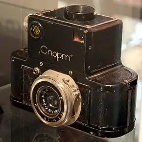 The development of the "Sport" was a lengthy process. It was predeceeded by the "Filmanka" SLR designed in Russia by A. A. Min as early as 1931.[2] The "Filmanka" was transferred to GOMZ and may have inspired the pre-production Gelveta design, which turned into the "Sport" production model. The B and 1/25 to 1/500 second focal-plane shutter employs a pair of metal plates, which form a vertically rising slit during exposure. The slit width determines the exposure. The shutter operation incorporates a quick-rising non-returning reflex mirror. The combined shutter speed dial and wind-on knob, situated on the right-hand side, is stationary during exposure. The film transport is from cassette to cassette, no rewind is provided. The original pair of cassettes would take enough film for fifty exposures. A manual-reset frame counter is at the base of the wind-on knob. The camera has an eye-level vertical viewfinder for looking down onto the focusing screen, as well as a built-in direct vision "action finder". The integral camera base and back is removed for film loading. The camera was designed to take interchangeable bayonet mounted lenses, but the only lens available was the Industar "И-10 1 : 3, 5 F = 5 cm" lens. Except for a few examples there is no serial number on the camera body, the lens serial number is used for identification. The camera bayonet lens mount incorporates the focusing helix with an infinity catch, and the mount itself is similar to that for the Zeiss Ikon Contax.[3]
