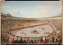 The first big bullring in the city, built in 1749 during the reign of Ferdinand VI, was located next to the puerta de Alcalá.[9] It lasted until the 1870s, and it was replaced in 1874 by the bullring of Goya, located in the plot currently occupied by the Palacio de los Deportes.[9]
