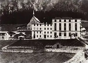 The first visitors mostly came because their doctors had recommended a health cure, but these were soon joined by more recreational travellers. From about 1850 there was a rapid growth in mountaineering as a leisure activity. Pioneering mountain tourists, many of whom came from England, favoured Pontresina over St. Moritz as a starting point for their Engadin climbing holidays. The first edition of 's "Piz Languard Und Die Bernina-gruppe Bei Pontresina, Oberengadin" appeared in 1858.[7] In this early tour guide the parish priest for St. Moritz and Samedan described the hiking and mountaineering tours in a wide area around Pontresina. The local "Improvement Association" ("Verschönerungsverein") was founded in 1872 and by the 1890s had laid out a network of paths and riding tracks extending to more than 80 km (50 miles).[8] The routes were given euphonous names such as "Schluchtenpromenade", "Thaispromenade" or "Flazpromenade" and their total cost was recorded as 35,151 Swiss francs.[8]