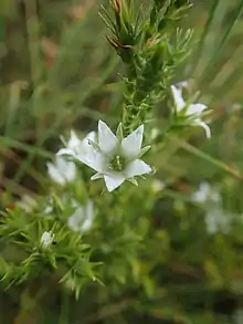 Sprengelia sprengelioides is a species of flowering plant of the family Ericaceae, and is endemic to near-coastal areas of eastern Australia. It is an erect shrub with egg-shaped leaves, and white flowers arranged singly in leaf axils.