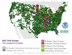 ![]() 100 populated locations were experiencing major or moderate flooding on May 8, 2011. Source: National Weather Service | |