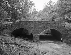 The Spring Lake Bridge is a historic bridge in the eastern part of Ozark-St. Francis National Forest, carrying County Road 35 across an inlet of Spring Lake known as Bob Barnes Branch, in the Spring Lake Recreation Area with the Ozark–St. Francis National Forest. It is a two-span closed-spandrel stone arch bridge with a total length of 36 feet (11 m). Each arch is 10 feet (3.0 m) long and 6 feet (1.8 m) high. Built in 1936 with federal funding, it is one of the state's finest examples of a stone arch bridge.[2]