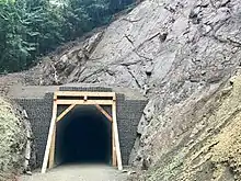 In April 2017, Bruch and Bruch Construction of Port Angeles received a $1.2 million contract to restore the 450-foot long tunnel, and widen the trail segment to roughly 12 feet.[2] This began with blasting the south end of the tunnel, opening it from end-to-end. Debris was then cleared from the tunnel, and workers began reinforcing the inside by applying "shotcrete" to the tunnel walls. Next, a Mechanically stabilized earth (MSE) wall was built around the arch pipe on the northeast entrance to the tunnel, with a facade added to represent the tunnel's original appearance.