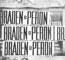 He held several brief but important ambassadorships in Colombia (1939–1942), Cuba (1942), and Argentina. As ambassador to Argentina for four months in 1945, Braden encouraged the opposition against President Edelmiro Julián Farrell and Juan Perón.[7] Perón exploited his intervention with a slogan, Braden o Perón ("Braden or Perón"), which contributed to Perón's victory in the presidential election the following year.[8]