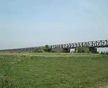 In 1865, the RhE extended its line from Kleve to Griethausen, where it built a 100-meter-long truss bridge (the Griethausen railway bridge) over an old course of the Rhine, which still stands today. This was followed by a 314 m-long approach structure with 20 spans. The line then ran across the Rhine island of Salmorth to the Rhine in Spyck where a marshalling yard with four tracks was built for the breaking up and assembling of trains for the train ferry operation. The crossing to the right bank of Welle is one of the narrowest points of the lower Rhine where currents make it possible for a ferry to cross. A similar marshalling yard was built on the line to Elten, which crossed the small Wild river with a 130 m-long bridge with seven spans. It then connected with the Emmerich–Zevenaar line to run to the Dutch border. NRS had already completed its 5.10 km-long section of the line from there to Zevenaar on 9 March 1864.