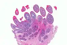 | Micrograph showing a squamous papilloma of the tongue. H&E stain. | |