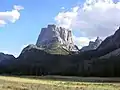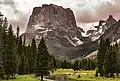 The peak is the emblematic geographical feature of the remote Wind River Range and is set seven miles west of the Continental Divide.[5] It is situated in the Bridger Wilderness on land managed by Bridger-Teton National Forest. Topographic relief is significant as the northeast aspect rises 3,700 feet (1,100 meters) above the Green River in one-half mile. The iconic view of Squaretop and Green River Lakes has been on the Wyoming license plate since 2016.
