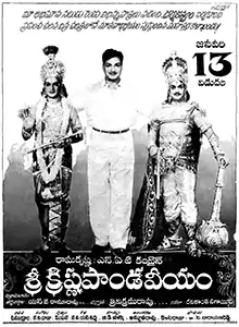 Sri Krishna Pandaveeyam (transl.Lord Krishna and the Pandavas) is a 1966 Indian Telugu-language Film based on Hindu Puranas directed by N. T. Rama Rao who wrote the film with Samudrala Sr. It is produced by N. Trivikrama Rao under the NAT and Ramakrishna Cine Studios. The film stars N. T. Rama Rao, Uday Kumar and S. Varalakshmi, with music composed by T. V. Raju. N. T. Rama Rao portrayed the roles of both Krishna and Duryodhana in this movie. it also marked the Telugu debut for actress, K. R. Vijaya.[2] The film was successful at the box office.[1]