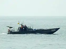 The professional head of the navy is the Commander of the Navy, currently Vice Admiral Priyantha Perera.[2] The commander-in-chief of the Sri Lanka Armed Forces is the President of Sri Lanka, who heads the National Security Council; the Ministry of Defence is the organization where ship buying policies are made for the navy.[3] The Sri Lanka Navy has five Advanced Offshore Patrol Vessels (equivalent to a traditional patrol frigate), three Offshore Patrol Vessels, two missile boats, 40 fast attack crafts, more than 200 patrol boats, seven landing ships/craft, along with six auxiliary vessels.[4] Its personnel number is 48,000 of whom approximately 15,000 are deployed for shore duties.[5]