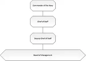 The professional head of the navy is the Commander of the Navy (C of N) who reports directly to the Minister of Defence. The Commander of the Navy exercises operational and administrative control of the Navy from Naval Headquarters in SLNS Parakrama, Colombo. He is assisted by the Chief of Staff (C of S); who along with Directors General and Directors comprise the Board of Management (BOM) and Board of Directors (BOD) of the Sri Lanka Navy.