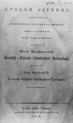 Srpski rječnik (Serbian Cyrillic: Српски рјечник, pronounced [sr̩̂pskiː rjê̞ːtʃniːk], The Serbian Dictionary; full name: Српски рјечник истолкован њемачким и латинским ријечма, "The Serbian Dictionary, paralleled with German and Latin words") is a dictionary written by Vuk Stefanović Karadžić, first published in 1818. It is the first known dictionary of the reformed Serbian language.[1]