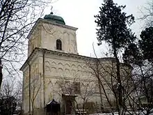 The church was built outside the old city walls, in a place known as the paupers' cemetery.[2] Atop the vestibule,[2] it has a single massive square spire, with five bells inside. Trefoil in shape, it has a foyer, vestibule, nave and altar; it is in the usual Moldavian style. The exterior walls are plastered and decorated with pilasters on two levels, one deep and the other in relief. Gheorghe Balș noted the prettiness of the iconostasis. The entrance is to the south.[1] Today, the interior walls are not painted, merely decorated with icons, but they appear to have been painted in 1855 by an artist from Sibiu.[1] The church's valuables include two large 18th-century bells; a chalice from 1856; a silvered icon of the Virgin Mary from 1845; and 18th-century church books in Old Church Slavonic, Greek and Romanian Cyrillic. An 1847 icon of Sabbas the Sanctified was brought by the donor from Mar Saba in 1905. The icon of the church's painters is also of note, old and decorated in silver.[1] In 1854, the first church choir in Moldavia was established here, after the Russian model. It was active for nearly six years, until the death of its founder, aga Evdochim Ianov; the initial director was Gheorghe Burada.[1][2]